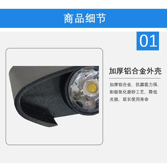 1、加厚鋁合金,抗腐能力強,樣機氧化磨砂工藝,降低光損,延長使用壽命
