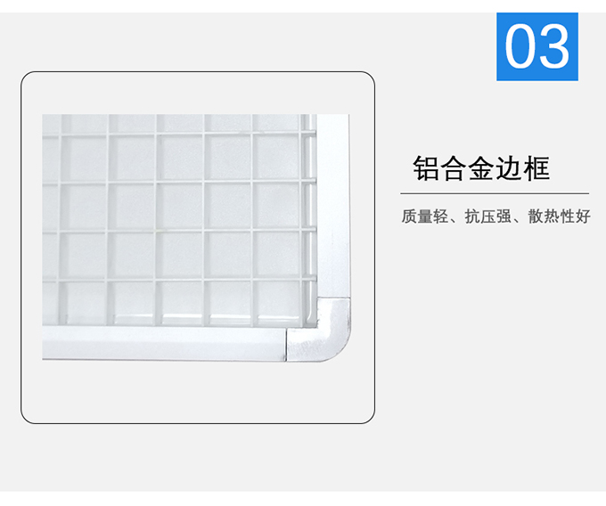 • 產(chǎn)品簡介:產(chǎn)品特點 1.多格柵深防眩擴散板設(shè)計,不刺眼、無頻閃保護視力 2.鋁材快散熱系數(shù)高,快速散熱,保證LED使用壽命 3.鋁合金金邊框,質(zhì)量輕、抗壓強、散熱性好