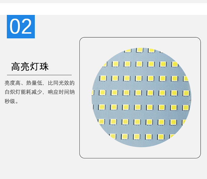 2.高亮燈珠,亮度高、熱量低,比同光效的白熾燈能耗減少,響應(yīng)時(shí)間納秒級(jí)。