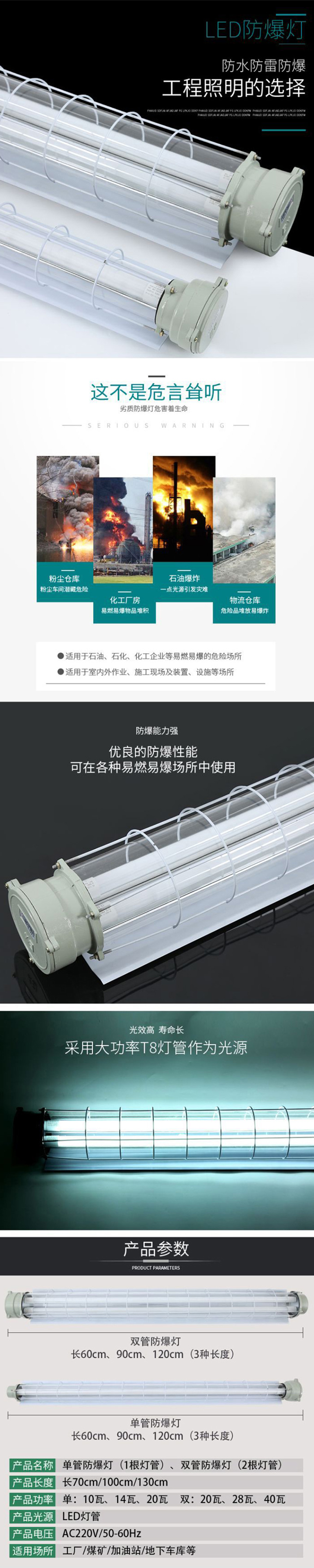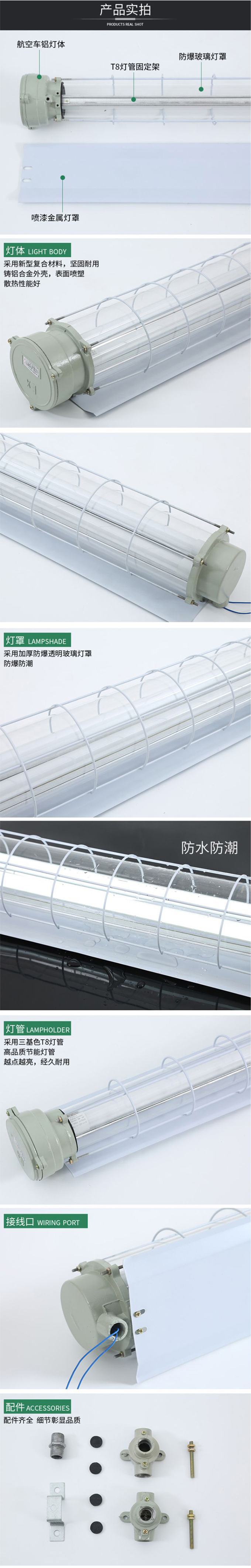 • 產(chǎn)品簡介:1、采用新型復(fù)合材料,堅固耐用鑄鋁合金外殼,表面噴塑,散熱性能好。 2、采用加厚防爆透明玻璃燈罩,防爆防潮。 3、采用三基色T8燈管,高品質(zhì)節(jié)能燈管,越點(diǎn)越亮,經(jīng)久耐用。