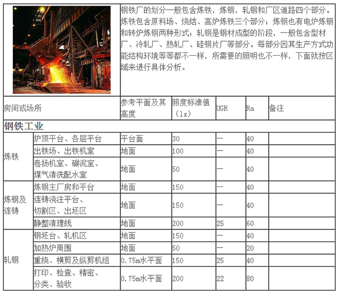 下面按照進(jìn)料、除塵、除渣、連鑄不同工段進(jìn)行照明分析與介紹