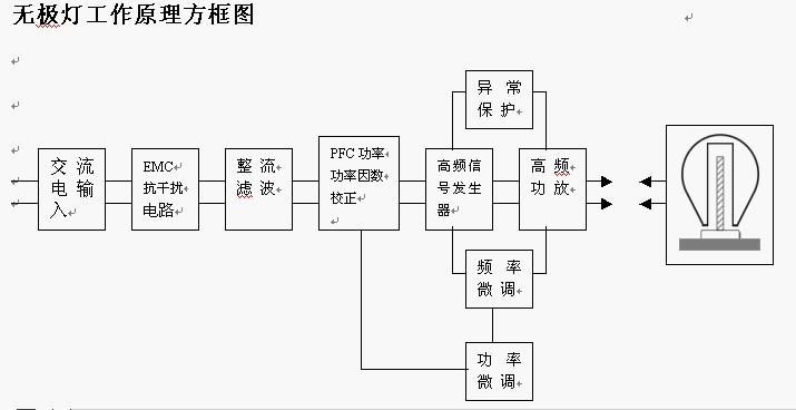 無極燈在結構上大致由三部分組成,高頻電子鎮(zhèn)流器,功率耦合器(內耦合,2.65MHZ)和涂有稀土熒光粉的玻璃泡殼(可以是多種形狀,大家見過圓球型的,方形的,等等)。無極燈鎮(zhèn)流器在市電(50HZ)的作用下,產生一個2.65MHz高頻正弦電壓,并同時產生一個3000V左右的點火電壓,通過功率耦合器在涂有稀土熒光粉的玻璃泡殼內瞬間建立一個高頻磁場,高頻磁場又同時產生高頻交變電場,導致泡殼內部的惰性氣體(氪氣和氬氣的混合氣體)發(fā)生電離并進而產生雪崩效應(應該是大學物理有講,半導體那一章,齊那擊穿和雪崩擊穿), 產生大量的紫外線輻射.熒光粉在紫外線作用下產生可見光.