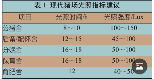 美國農(nóng)業(yè)生物工程學(xué)會(huì)建議后備 / 配懷母 豬合適的光照強(qiáng)度在 100 Lux 左右,光照時(shí) 間為每天 14 h ~ 16 h。