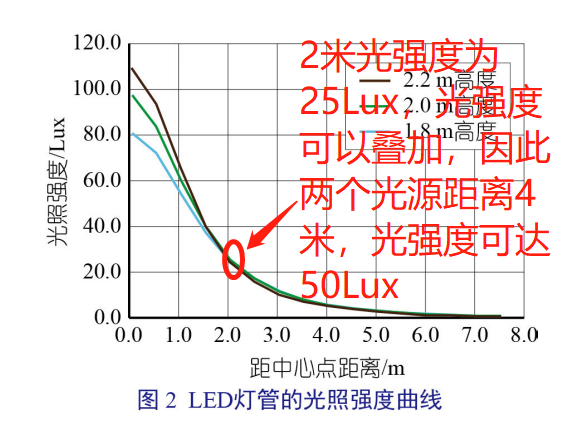 LED 燈 管 (18 W、2 100 lm、 6 500 K) 作為單光源對(duì)分娩舍內(nèi)的光源進(jìn)行 布置。LED 燈管的光照強(qiáng)度曲線如圖 2。分娩 舍所需的光照強(qiáng)度為 50 Lux ~ 100 Lux。從 圖 2 查得在地面距離燈管中心水平距離 2 m 處的光照強(qiáng)度為 25 Lux。根據(jù)光照強(qiáng)度的可 疊加性,將兩燈管的水平距離設(shè)置為 4 m,則 在兩燈管水平距離中心處地面的光照強(qiáng)度為 50 Lux,滿足分娩舍光照強(qiáng)度需求。